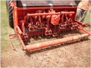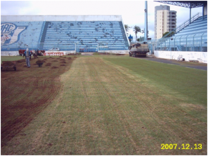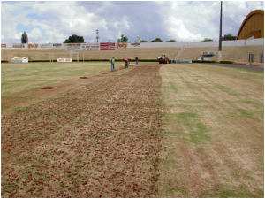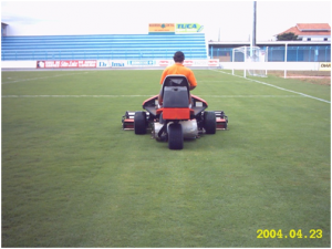 2 – AERAÇÃO E DESCOMPACTAÇÃO: Um dos principais problemas dos gramados esportivos no Brasil é a compactação do solo, que impede a troca de gases entre o ar e o solo, tendo como conseqüência a limitação no crescimento das raízes da grama e a partir daí também da parte aérea (folhas). Além disso, um solo compactado impede a infiltração de água prejudicando a drenagem. A Descompactação do solo por cima do gramado é feita com equipamento profissional Verti-Drain, onde são utilizados pinos sólidos que perfuram o gramado numa profundidade de 15 a 25 cm, criando novos espaços para o desenvolvimento das raízes. Já na Aeração os pinos sólidos são substituídas por pinos vazados que retiram tubetes de solo compactado, os quais devem ser posteriormente retirados do gramado.